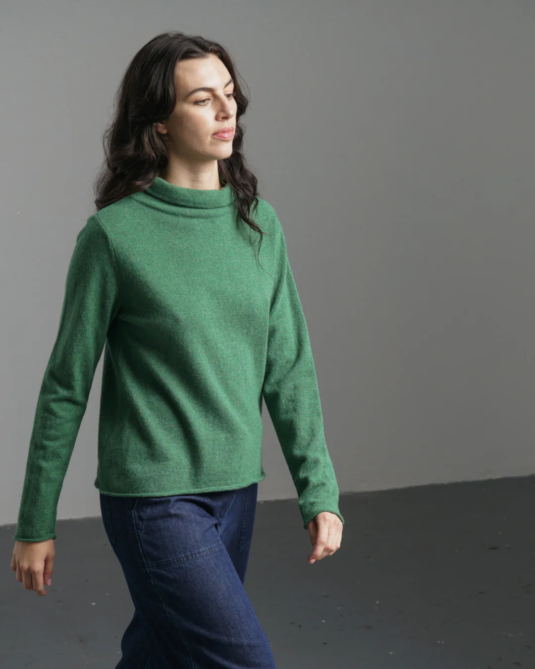 A soft, fine knit roll-neck jumper made from pure Merino wool. One of the lighter-weight pieces in the collection, it still offers plenty of warmth. Designed with a timeless boat neck and a short, roll-up collar, it sits neatly on the shoulders with a subtle A-line shape for a flattering, easy fit. Finished with rolled cuffs and hem for a simple, relaxed look. Soft enough to wear next to the skin or layered as the seasons shift. One of our most loved styles, available in a selection of rich, timeless shades—this one is a rich navy.