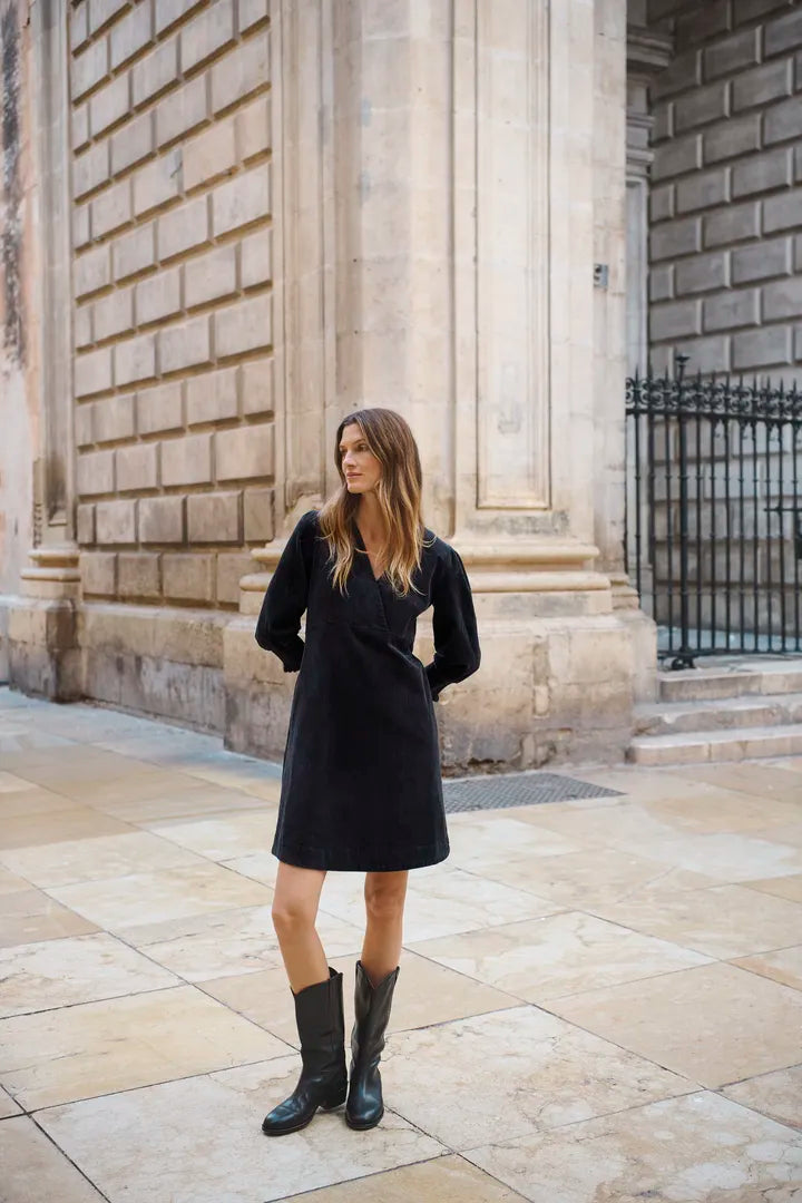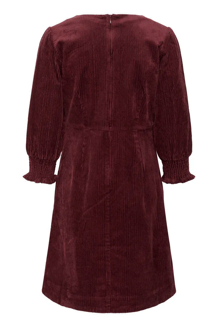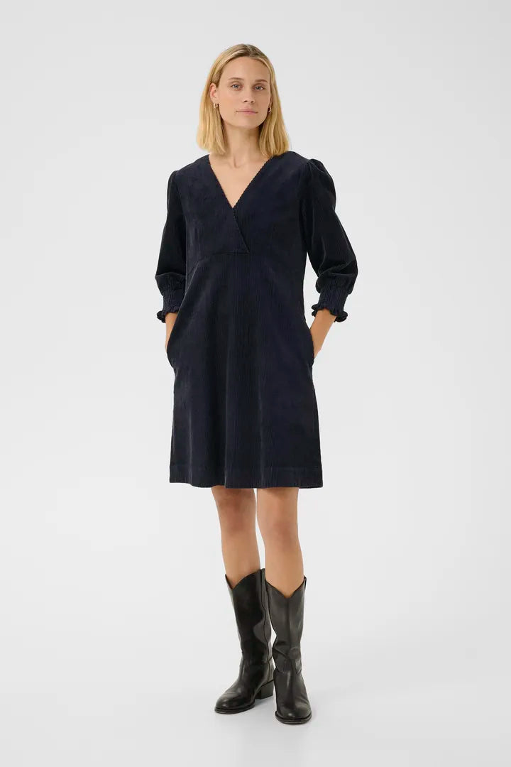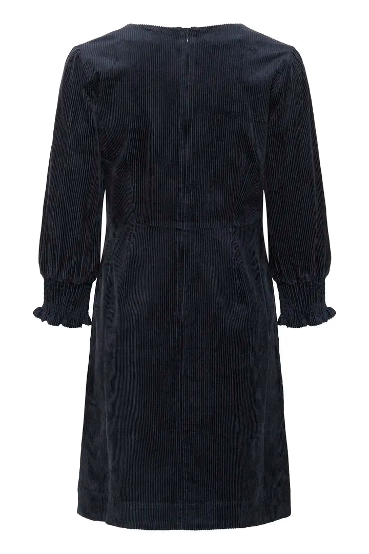 This corduroy dress features a feminine V-neckline and a softly defined waist for a flattering silhouette. The three-quarter sleeves with gathered cuffs add a delicate, relaxed touch. A comfortable piece for both everyday wear and cosy moments. 83% Cotton, 15% Viscose, 2% Elastane.