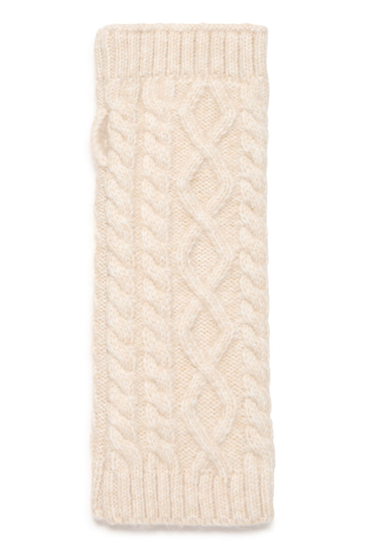 Cable knit mittens with extended wrist warming length and hole for thumb. 69% Polyester 20% Acrylic 11% Nylon