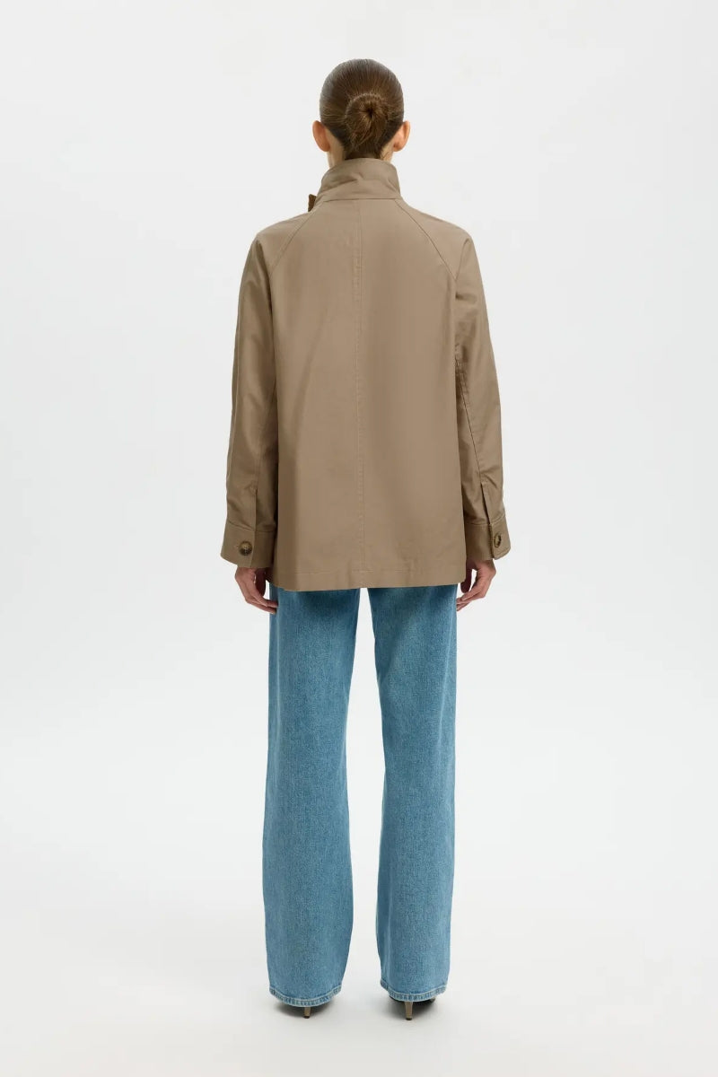 Simple yet timeless, this cotton jacket is steeped in fashion heritage. It includes elements drawn from the trench coat and wax jacket, such as the corduroy collar and beautiful beige finish. We would wear it with wide leg jeans and roll neck on cooler days and a classic white T on warmer spring days. The Selected Femme Kylie Jacket in Teak is a versatile wardrobe essential that effortlessly bridges seasonal transitions. Featuring a relaxed loose fit with distinctive raglan sleeves, front patch pockets with flaps; this jacket offers comfortable, unrestricted movement perfect for layering. 50% Cotton 50% Recycled Cotton.