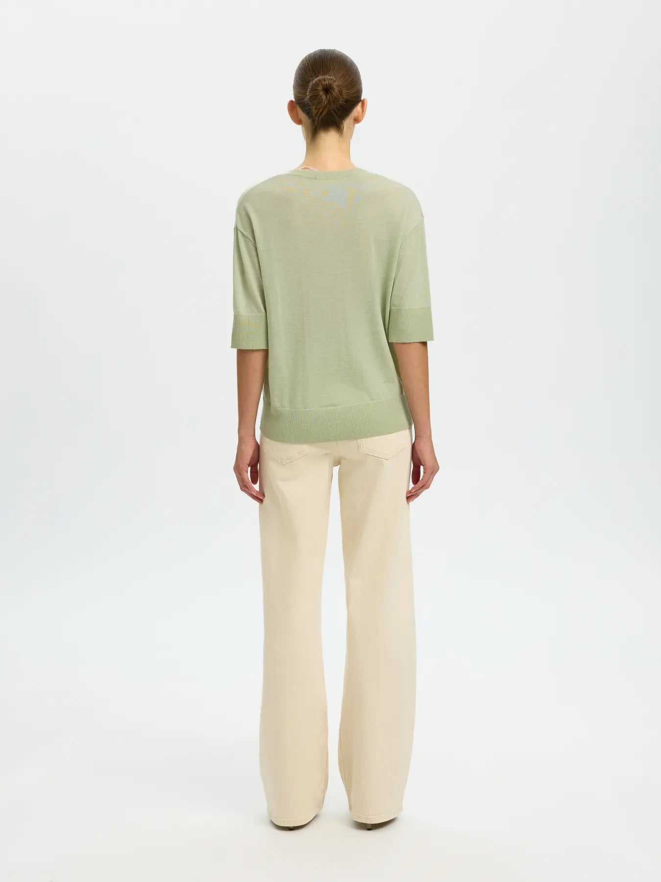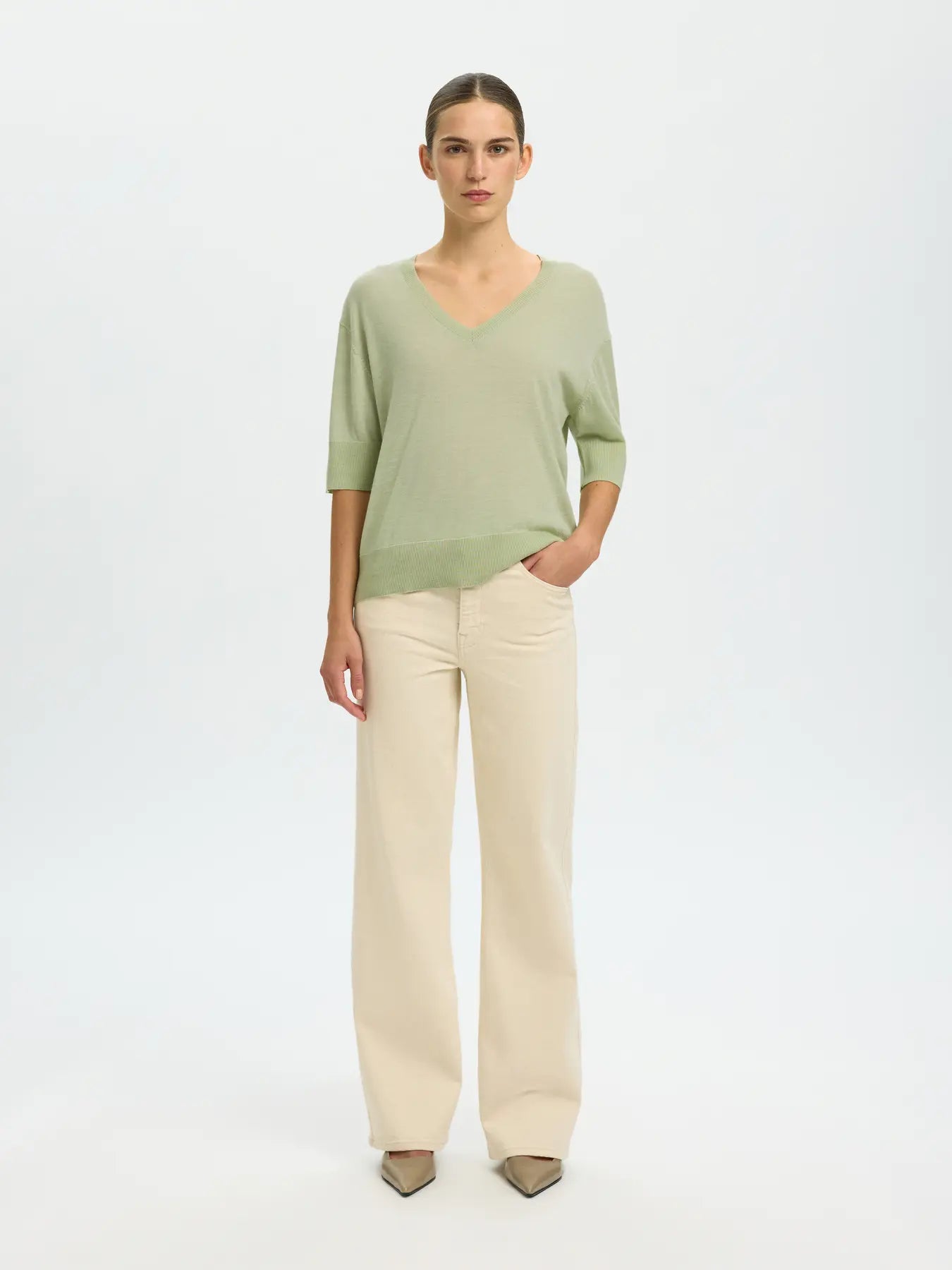 Keep it simple with this quality lightweight knit V neck top. It's ideal for layering or styling solo and would look great with a pair of dark denim wide leg jeans. With a relaxed fit, short sleeves, V neck and deep rib hem and cuff. 100% Merino Wool
