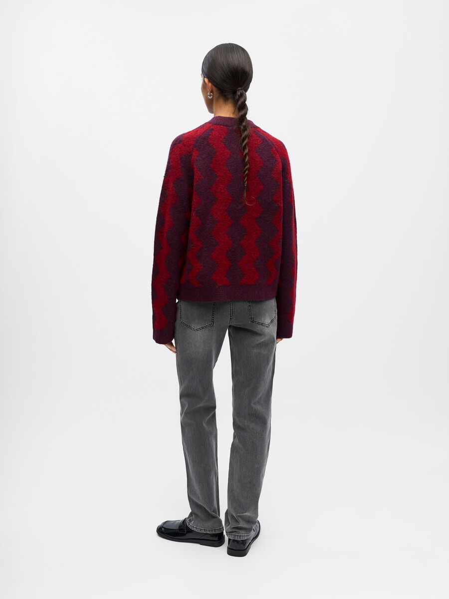 A striking cosy vertical zig zag patterned knit for wearing back with your winter jeans and cords. In a lovely blend of rich reds it is the perfect knit to wear for country walks or weekends away. With ribbed crew neck, hem and cuffs, raglan sleeve and relaxed fit. 52% Recycled Polyester, 21% Acrylic, 12% Nylon, 6% Alpaca Wool, 6% Wool, 3% Elastane.