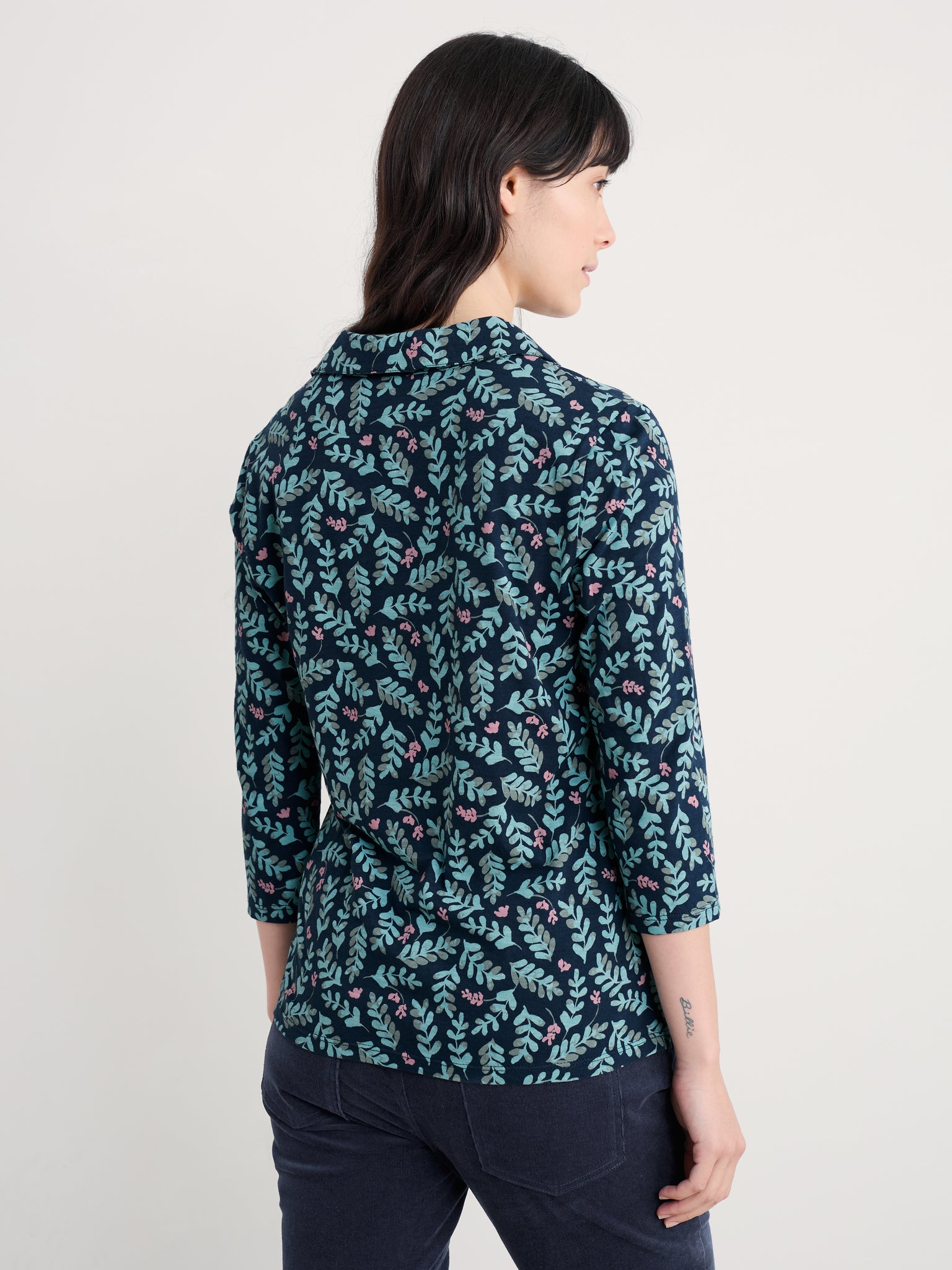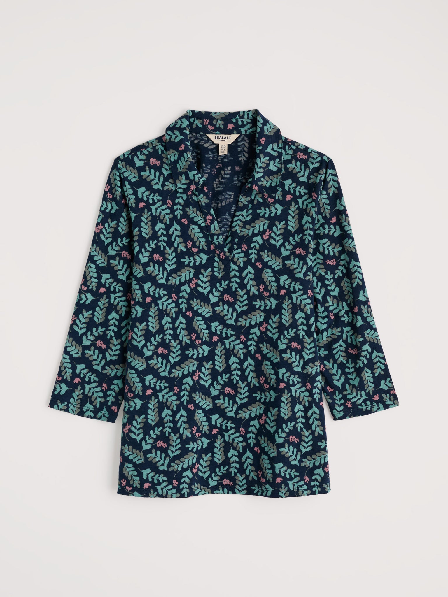 An organic cotton jersey shirt with a softly rounded collar and notch neckline. Seasalt have given it a relaxed fit, finished with a curved hem and small side slits for easy movement. Available in a lovely hand-drawn storytelling Seasalt print. Style with jeans when the weather turns cooler.